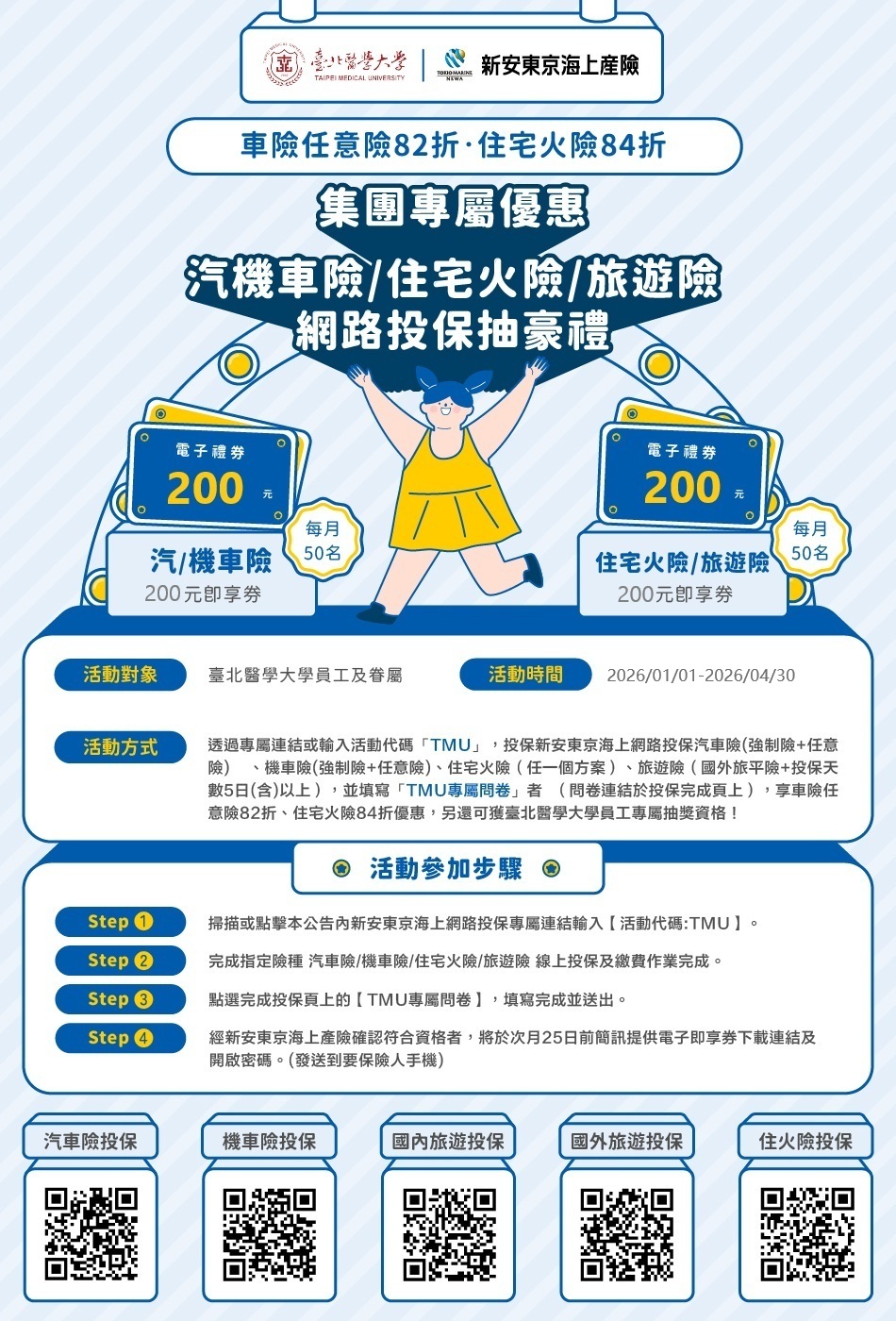 【活動說明】本校員工透過專屬連結,輸入活動代碼「TMU」,投保新安東京海上產險-汽車險(強制險+任意險)、機車險(強制險+任意險)、住宅火險(任一方案)、旅遊險(國外旅平險+投保天數5日(含)以上,
