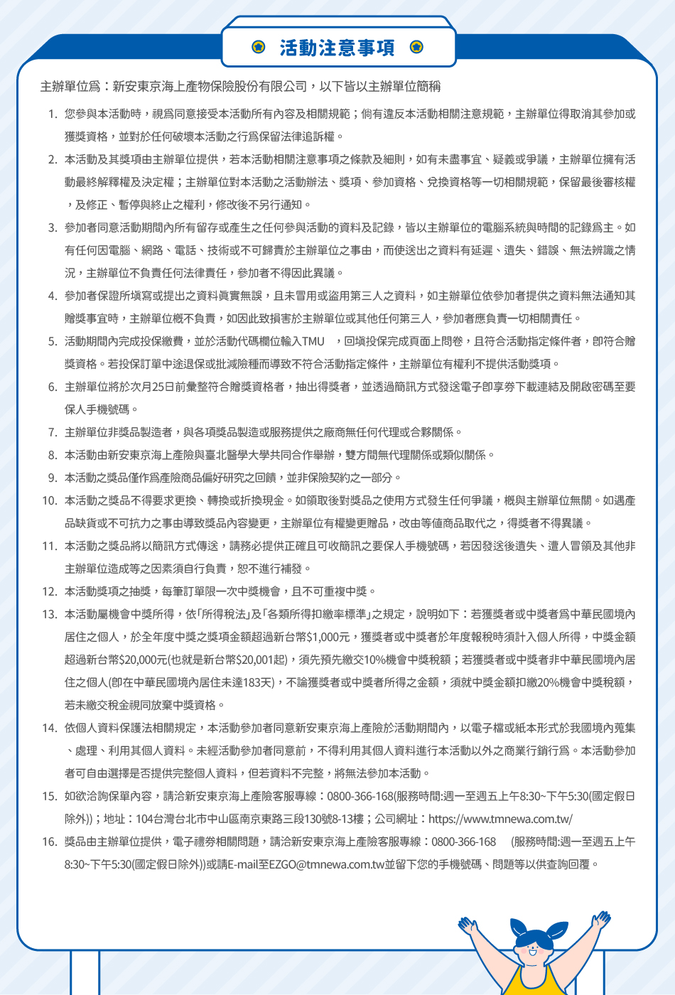 並填寫「TMU專屬問卷」者 (問卷連結於投保完成頁上),除享車險任意險82折、住宅火險84折優惠,另還可獲本校員工專屬抽獎資格!